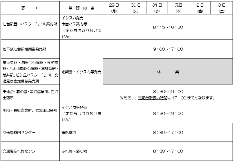仙台市交通局案内センター ☎022-222-2256月~金 8:30~18:30 土・日・祝及び12/29~1/3 8:30~17:00