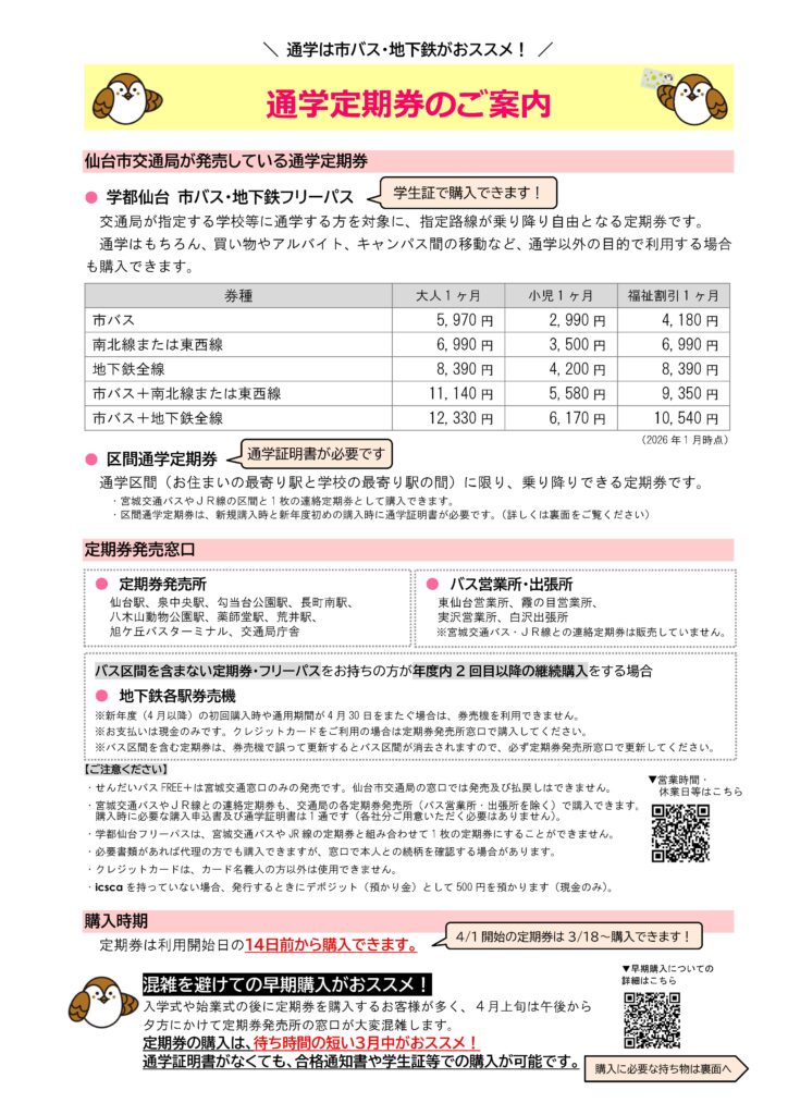 ○ 市バス・地下鉄乗り放題の通学定期券「学都仙台フリーパス」についてはこちら