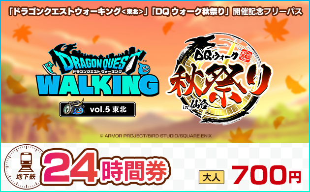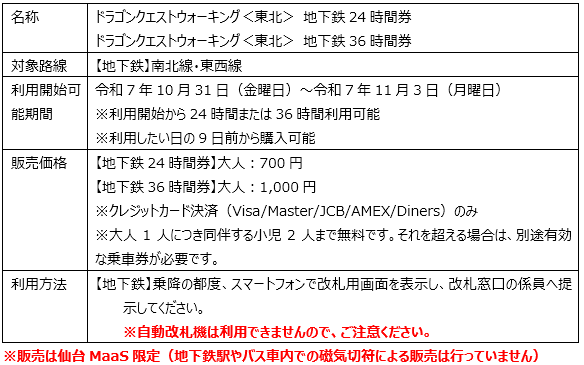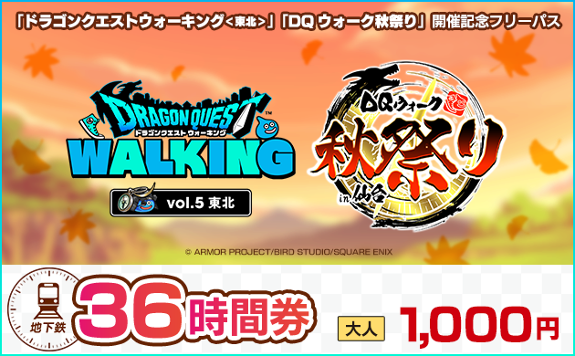 「ドラゴンクエストウォーキング<東北>」及び「ドラゴンクエストウォーク秋祭り」が開催されることを記念し、地下鉄南北線・東西線を24時間または36時間利用できるデジタルチケットを「仙台MaaS」にて期間限定で販売します。スマートフォンひとつで購入できる、便利でお得な乗車券をこの機会にぜひご利用ください(各イベントに参加されない方も、期間中は当デジタルチケットをご利用いただけます)。