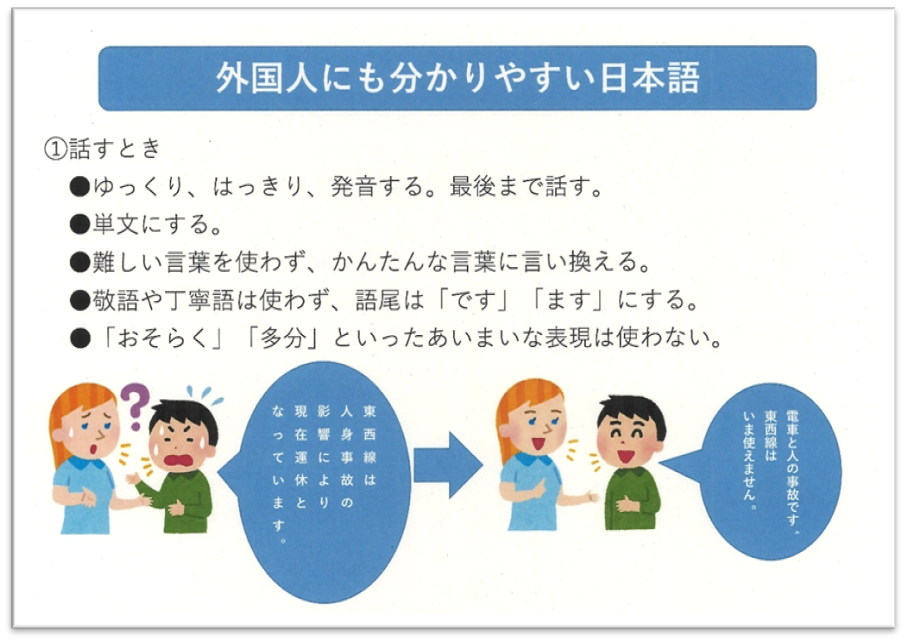 令和3年度は「やさしい日本語研修」を実施し、日本語をわかりやすく話す(書く)ことで外国人のお客さまとコミュニケーションをとり、スムーズな案内対応ができるよう取り組みました。