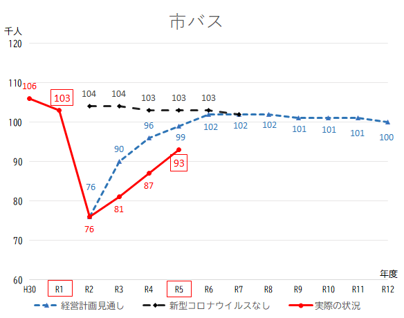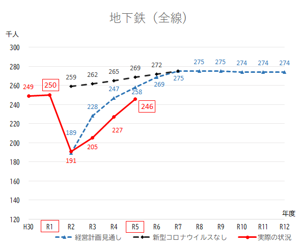 計画では、令和2年12月時点の新型コロナウイルス感染症の状況を踏まえ、市バス・地下鉄ともに乗車人員は段階的に回復し、令和7年度までには感染症による影響は解消するものと見込んでいました。しかしながら、その後の感染拡大及びその長期化により、見通しからは乖離が生じており、今後の回復の見通しについても、新しい生活様式の定着等により不透明となっています。
