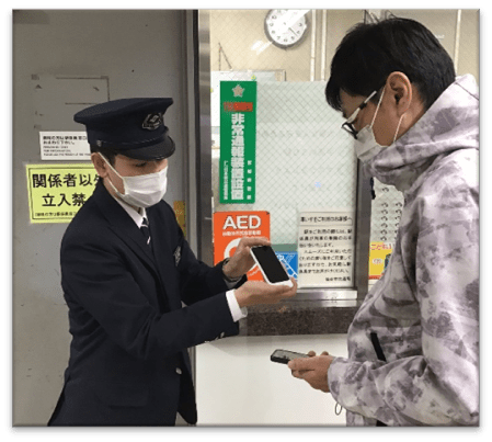 日本語による案内が難しい外国人のお客さまに対する案内サービスとして,全駅に配置しているタブレットの翻訳アプリによる対応を実施しています。