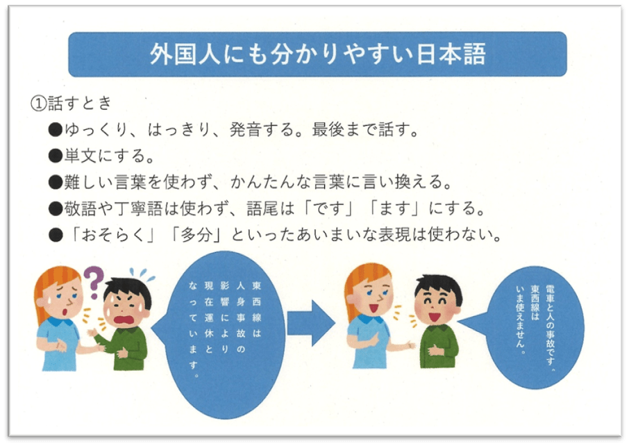 令和3年度は「やさしい日本語研修」を実施し,日本語をわかりやすく話す(書く)ことで外国人のお客さまとコミュニケーションをとり,スムーズな案内対応ができるよう取り組みました。