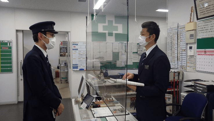 乗務助役が点呼時に地下鉄運転士の健康状態を確認します。
