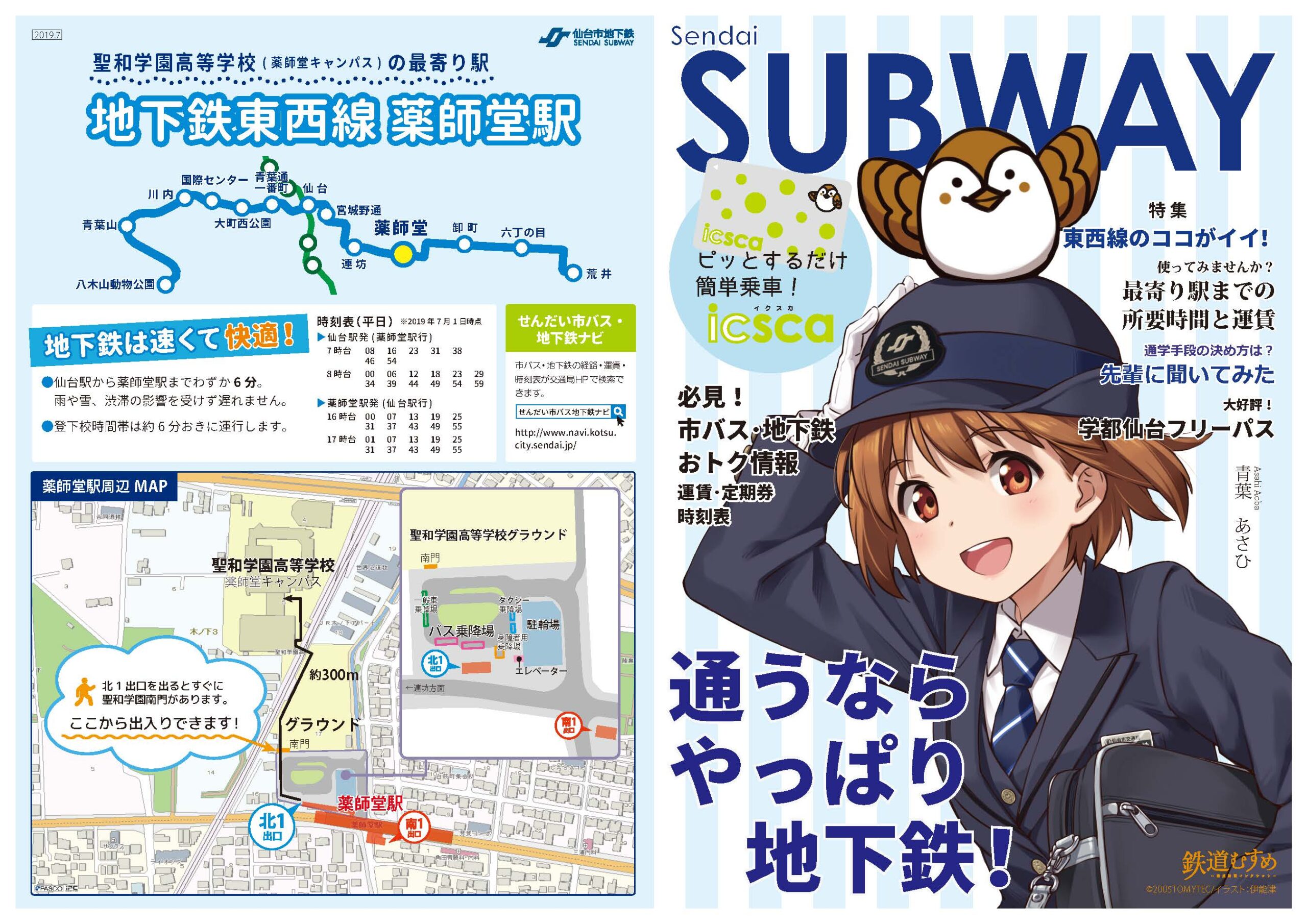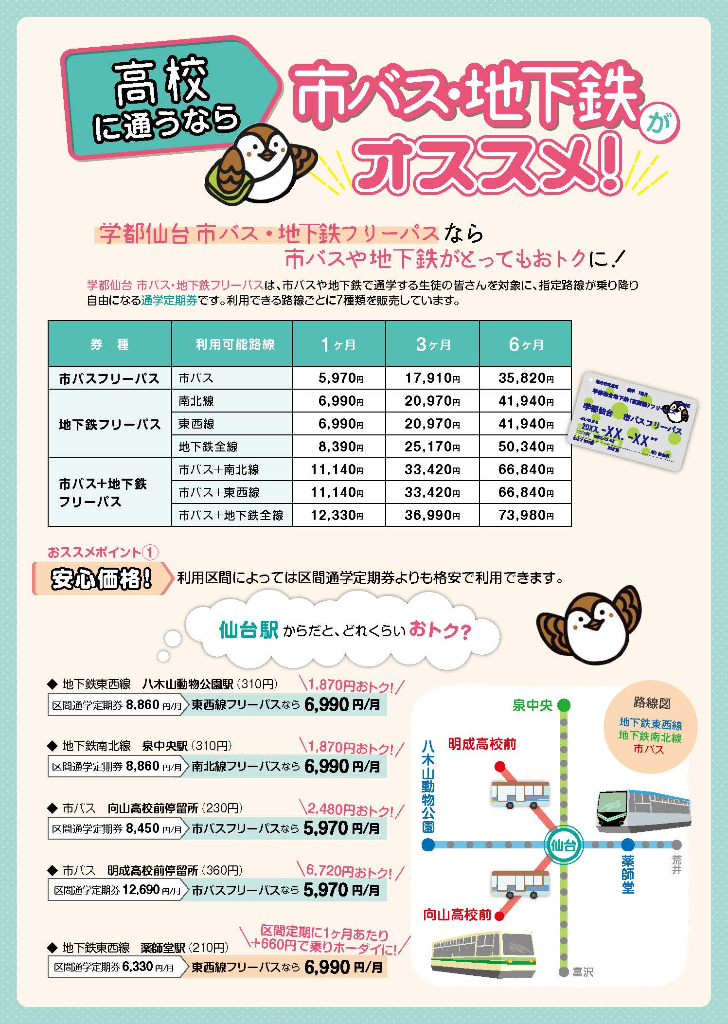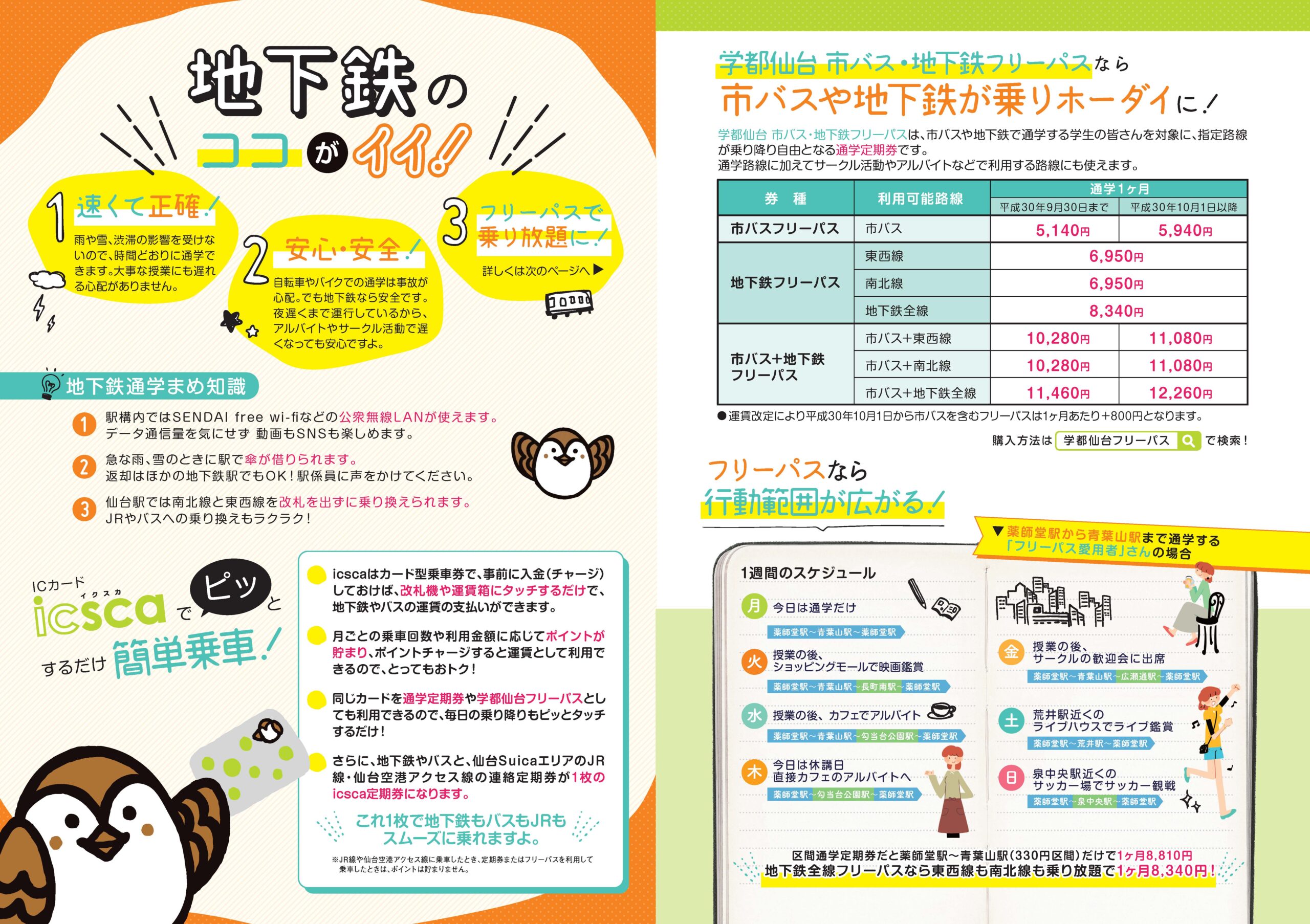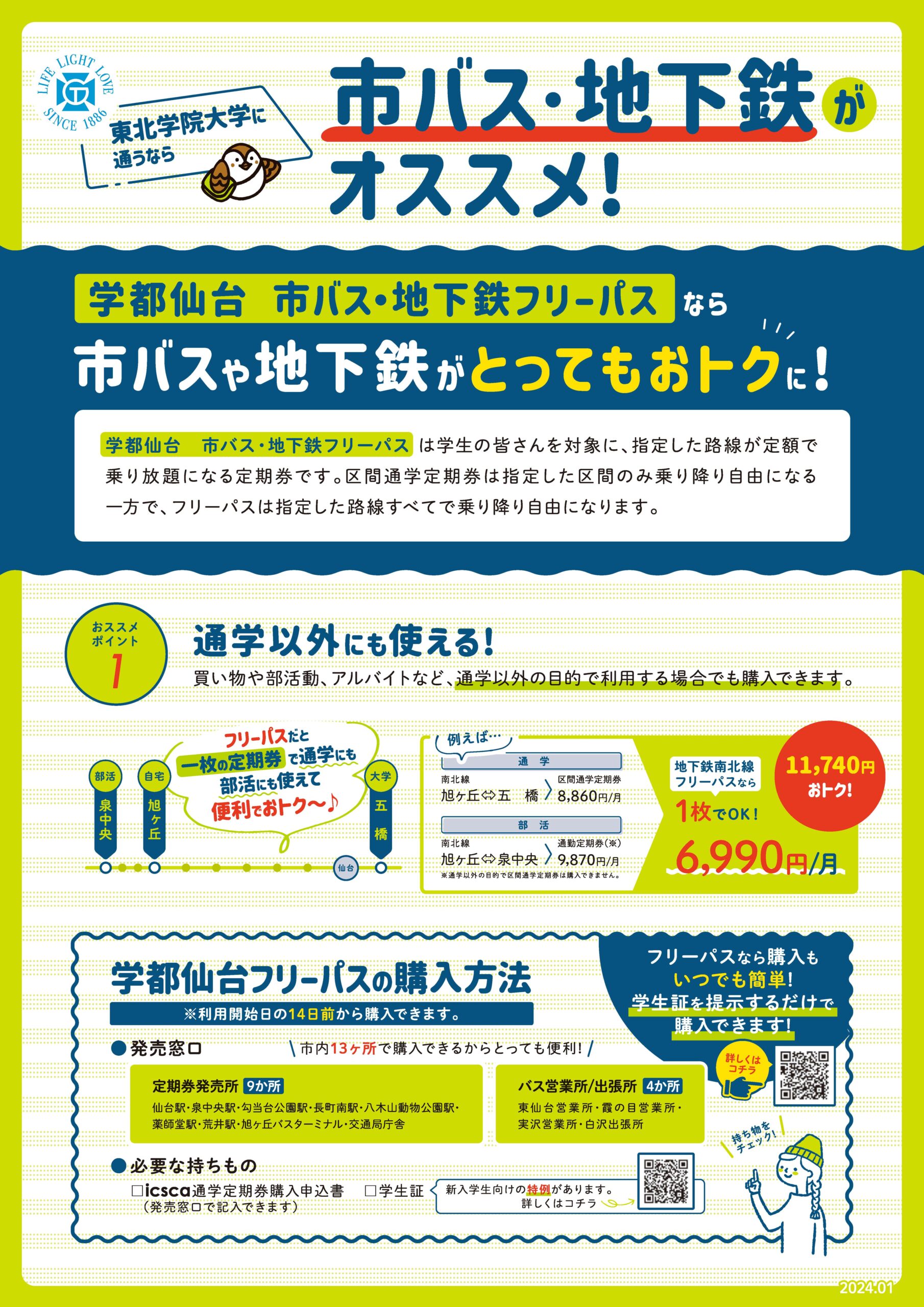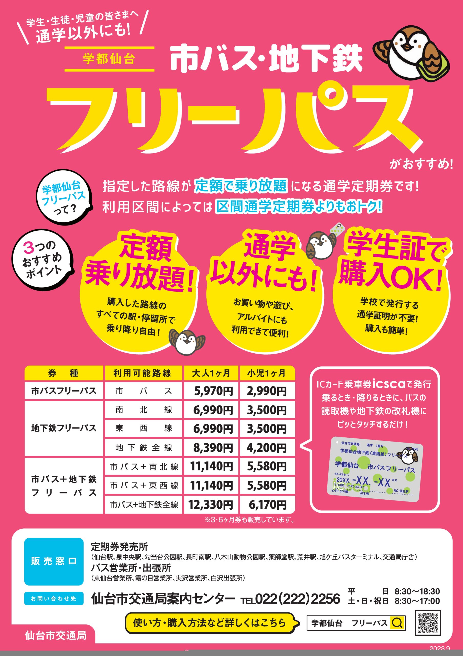 市バスや地下鉄で通学する学生向けの通学定期券「学都仙台フリーパス」のポスターを地下鉄駅構内や各営業所・出張所、定期券発売所窓口等に掲出しているほか、学校校内での掲出もお願いしています。また、仙台駅東西地下自由通路内にあるデジタルサイネージにおいて、「学都仙台フリーパス」の案内動画を掲出しています。