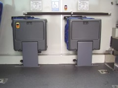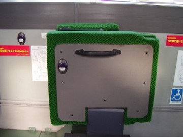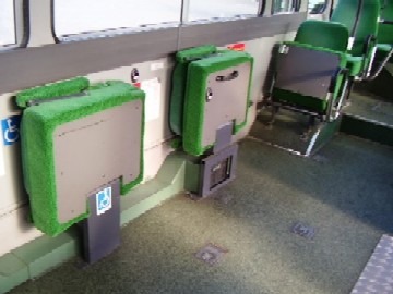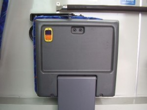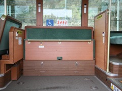 (4)固定ができたら発車です。降りる際は、折りたたんだ座席に付いている車椅子専用の降車ボタンで乗務員に連絡が出来ます。乗務員には車椅子のお客様からの連絡だとわかるようになっています。