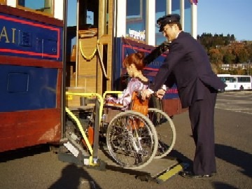 車椅子の固定などの作業は、乗り口スロープ板、固定ベルト、シートベルト等の使用方法を熟知している乗務員が行います。