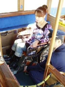 (4)固定ができたら発車です。降りる際は、折りたたんだ座席に付いている車椅子専用の降車ボタンで乗務員に連絡が出来ます。