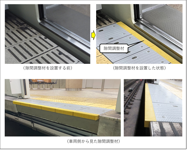 南北線のホームと車両の隙間は、現在、直線部分で約7cmあります。その隙間に、隙間調整材という櫛状のゴムを設置し、直線部の隙間を約3cm程度に縮小いたします。 ホーム端部など、ホームがカーブしている場合、隙間が3cmより広がる場所があります。