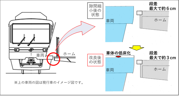 南北線のホームと車両の段差については、南北線車両を更新する際、車両側を低床化して縮小していくこととしています。現在、最大で約6cmある段差を、最大で約3cm程度に縮小する予定です。