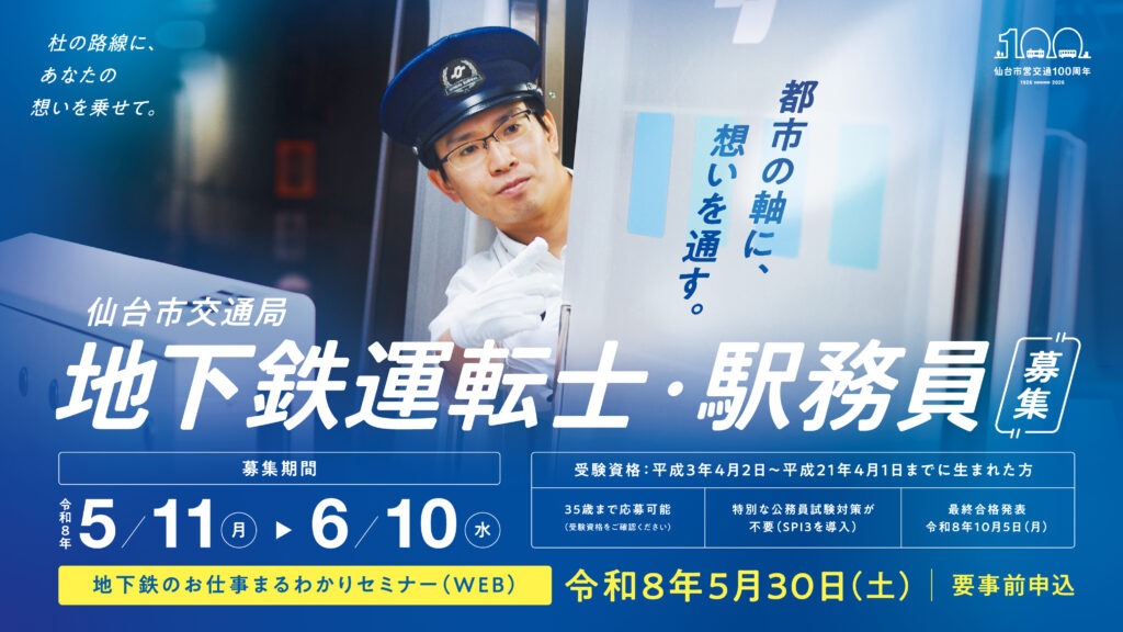 【5月11日募集開始】令和8年度仙台市交通局職員《高速鉄道運輸職員(地下鉄運転士・駅務員)》の募集を行います