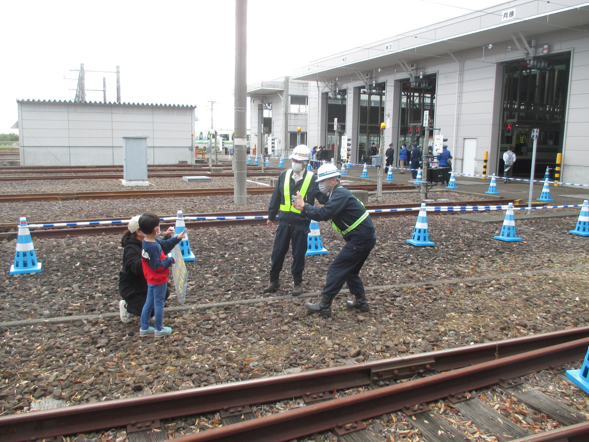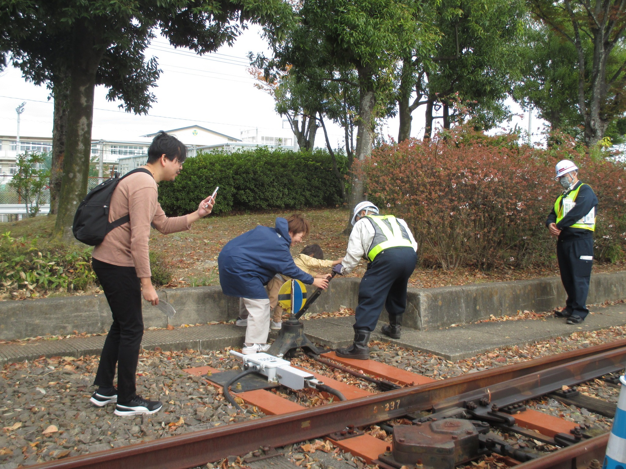列車の進路を分けるための手動転てつ器の転換を体験!さらに特別に線路内に立ち入っての記念写真を撮影!(線路内立ち入りの危険性についての説明もありました。)