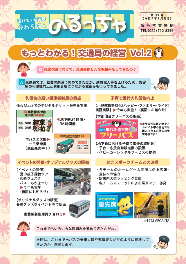 ●交通局1階乗車券発売所、地下鉄駅乗車券発売所(仙台駅、勾当台公園駅、泉中央駅、長町南駅、八木山動物公園駅、薬師堂駅、荒井駅)、旭ヶ丘バスターミナル乗車券発売所