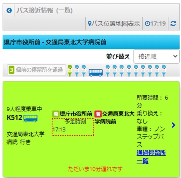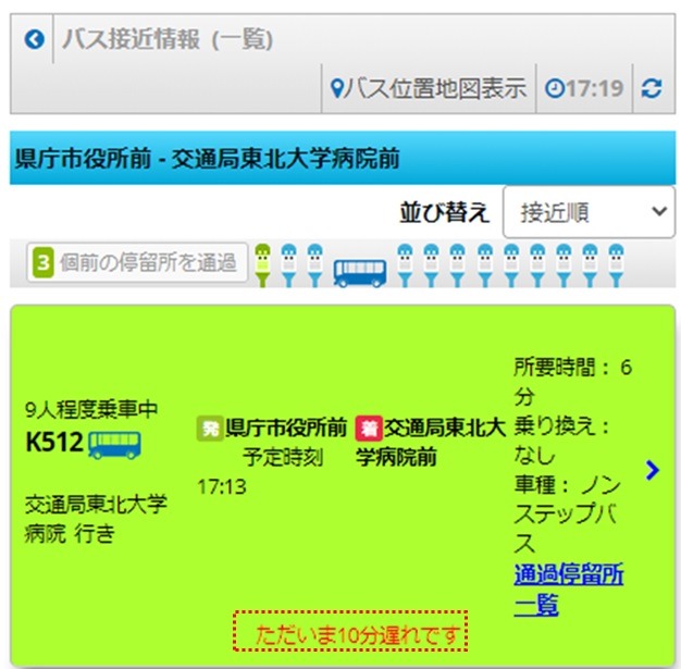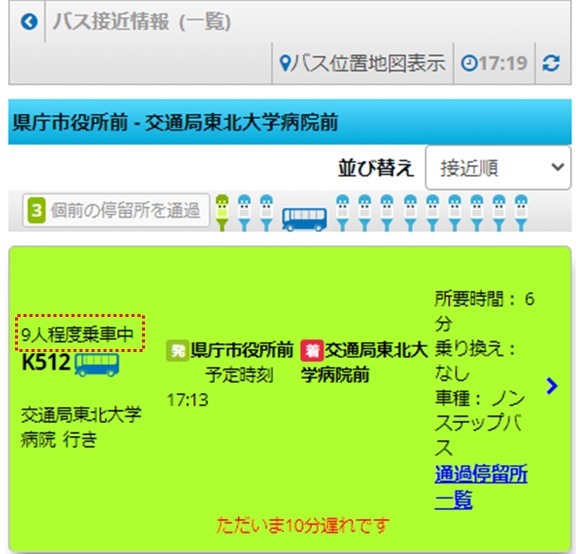 令和3年3月下旬ころより、「どこバス仙台」のバス接近情報(一覧)画面にバスの乗車人数をリアルタイムでお知らせいたします。 ※乗車人数のデータを取得できないこともあることから、多少の誤差があること。また、表示できないこともあることにご注意ください。