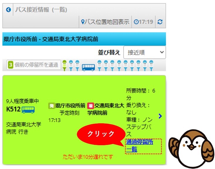 令和3年3月下旬ころより、「どこバス仙台」のバス接近情報(一覧)画面に表示されるバスがどこのバス停を通るのか調べることができるようになります。また同じ系統の他の便がどの地点を走行しているかを調べることができます。