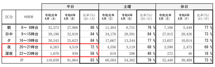 市バスの利用者数は、令和2年度に新型コロナウィルス感染症の拡大に伴い大幅な減少となった後、令和3年度以降は徐々に増加傾向に転じてはいるものの、本年6月時点では、令和元年度比で平日は8割、土曜・休日は7割程度の回復に留まっており、特に、平日の利用者数は、夜の20時から21時台は約7割、22時から23時台は約5割となっている現状です。
