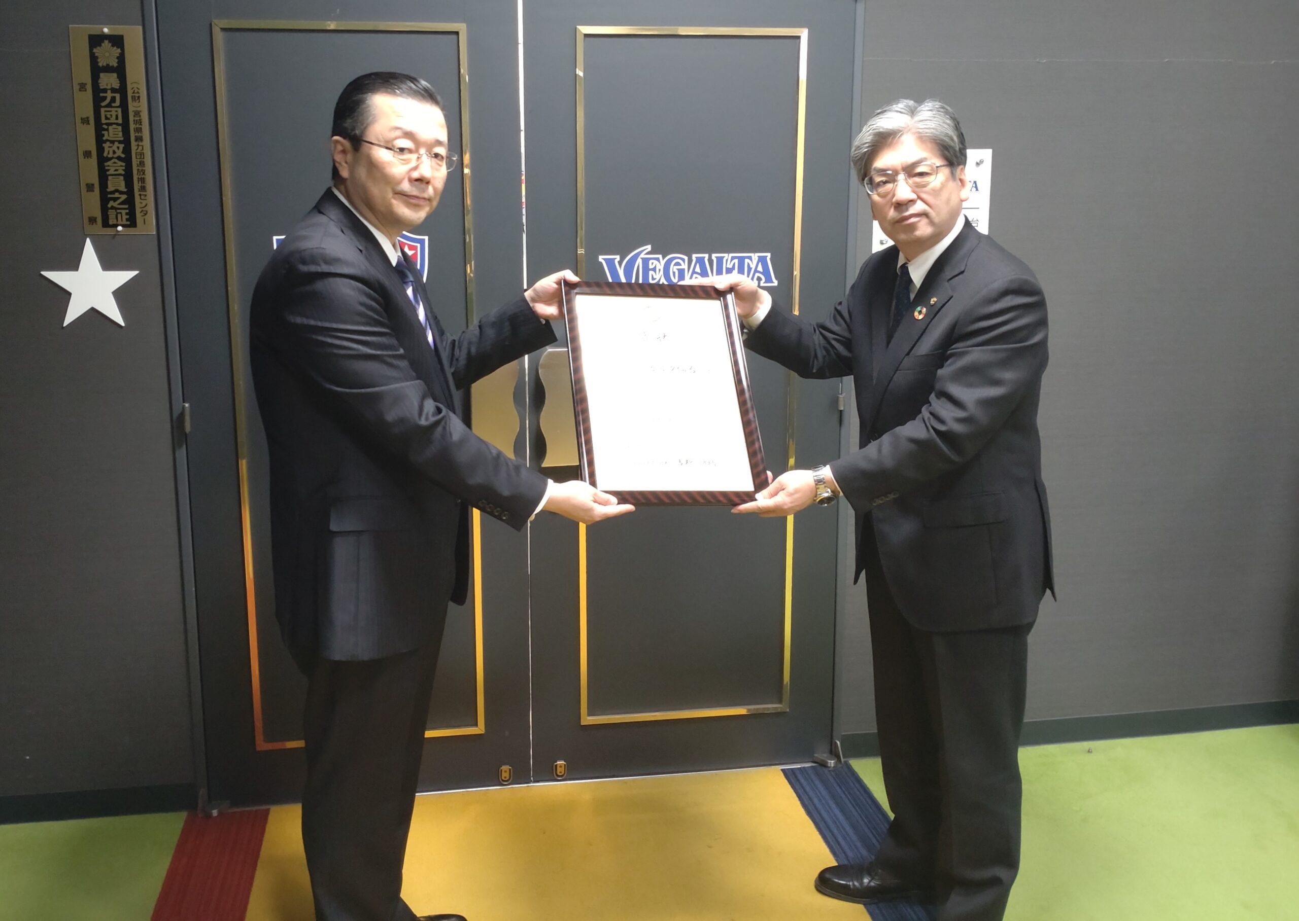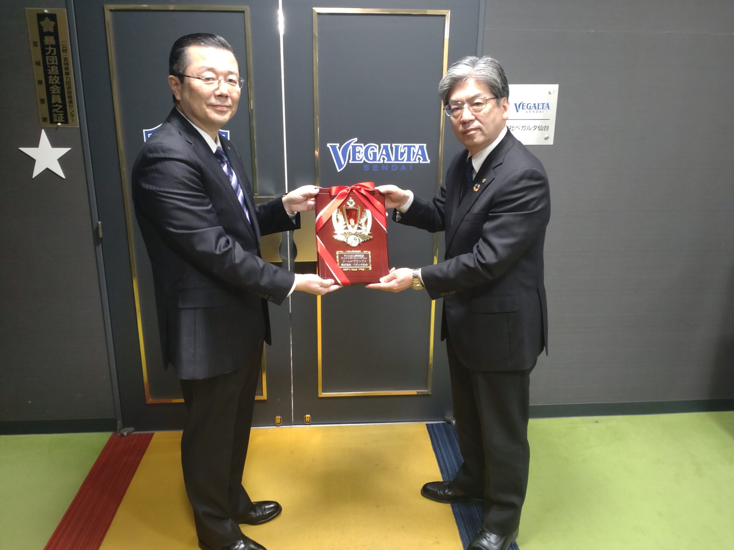 市バス80周年の記念事業の一環として実施しました『ラッピングバスコンテスト「あなたの推しバス教えてください」』において、ゴールドグランプリに選ばれました(株)ベガルタ仙台様を11月18日(金)に訪問し、交通事業管理者より(株)ベガルタ仙台 代表取締役社長 佐々木 知廣様に表彰状と表彰盾を授与させていただきました。
