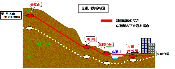 広瀬川は橋で渡る東西線が広瀬川を渡るには、川に橋を架けるか、または川の下を潜るしか方法はありません。広瀬川の下を通りますと、当然、川を挟んだ2つの駅は広瀬川よりも深くなります。また、広瀬川と青葉山では、約130mの高低差がありますが、電車が安全に運行できる勾配に限界がありますので、青葉山駅が極端に深い駅となり、地下鉄駅として非常に利用しにくくなってしまいます。 そこで、広瀬川に橋を架けて渡り、川内駅・国際センター駅を地表に近い位置にホームをつくることにより、青葉山駅をできるだけ浅くし、地下鉄を便利に利用できるように考えています。