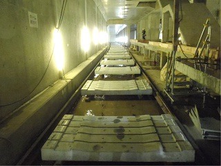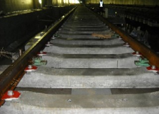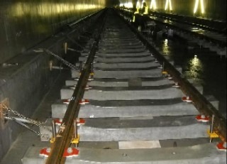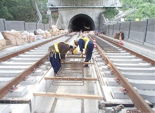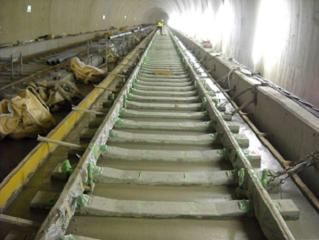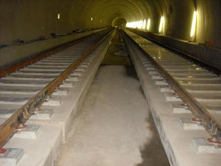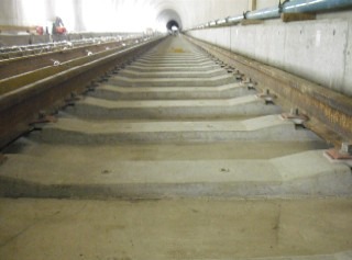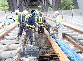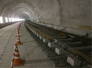 ![]() 青葉山トンネルのまくらぎの下のコンクリート打設後の状況です。 | ![]() 亀岡トンネルのレールとまくらぎを組み立てた状況です。 | |