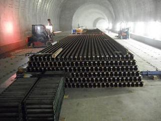 ![]() 青葉山トンネルのレール貯積の状況です。 | ![]() 青葉山トンネルの道床コンクリートの打設の状況です。 | |