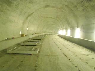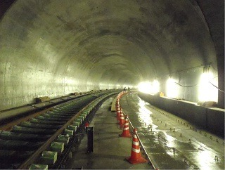 ![]() 青葉山トンネルの道床コンクリートを打設した状況です。(西行線) | ![]() 青葉山トンネルの道床コンクリートを打設した状況です。(東行線) | |