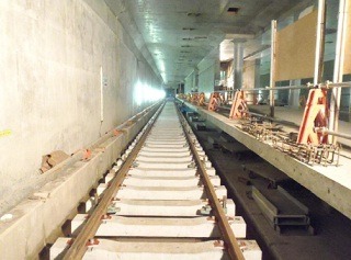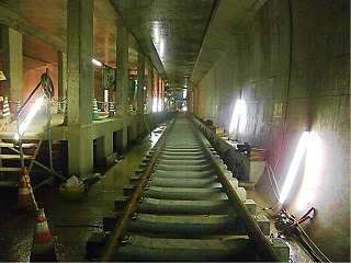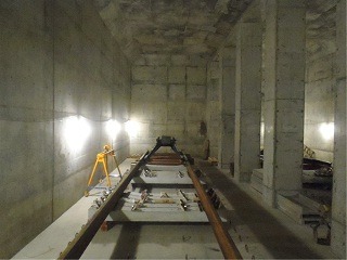 ![]() 青葉山駅でのレール敷設の様子です。 | ![]() 亀岡トンネル内のレール敷設の様子です。 | |