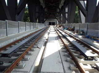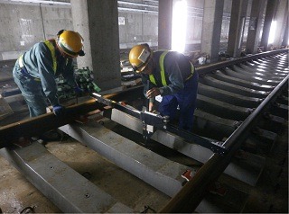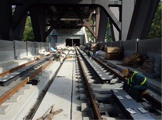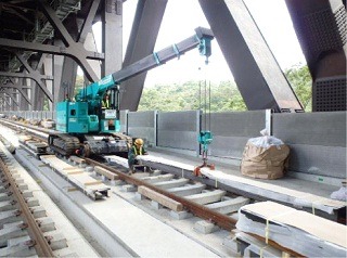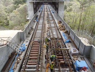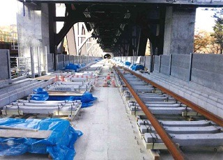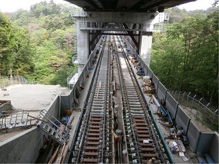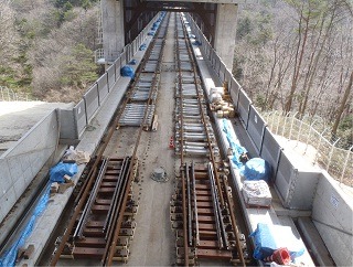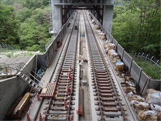 ![]() 八木山トンネルでのレール敷設の状況です。 | ![]() 竜の口橋りょうでのレール敷設の状況です。 | |