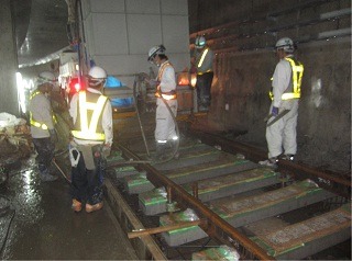 ![]() 青葉山駅でのレール溶接の様子です。 | ![]() 亀岡トンネル内のレール敷設の様子です。 | |