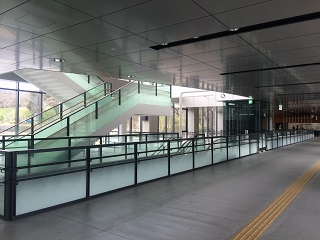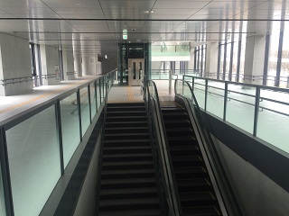 駅舎1階 改札内 ホーム階への階段・下りエスカレーターです。